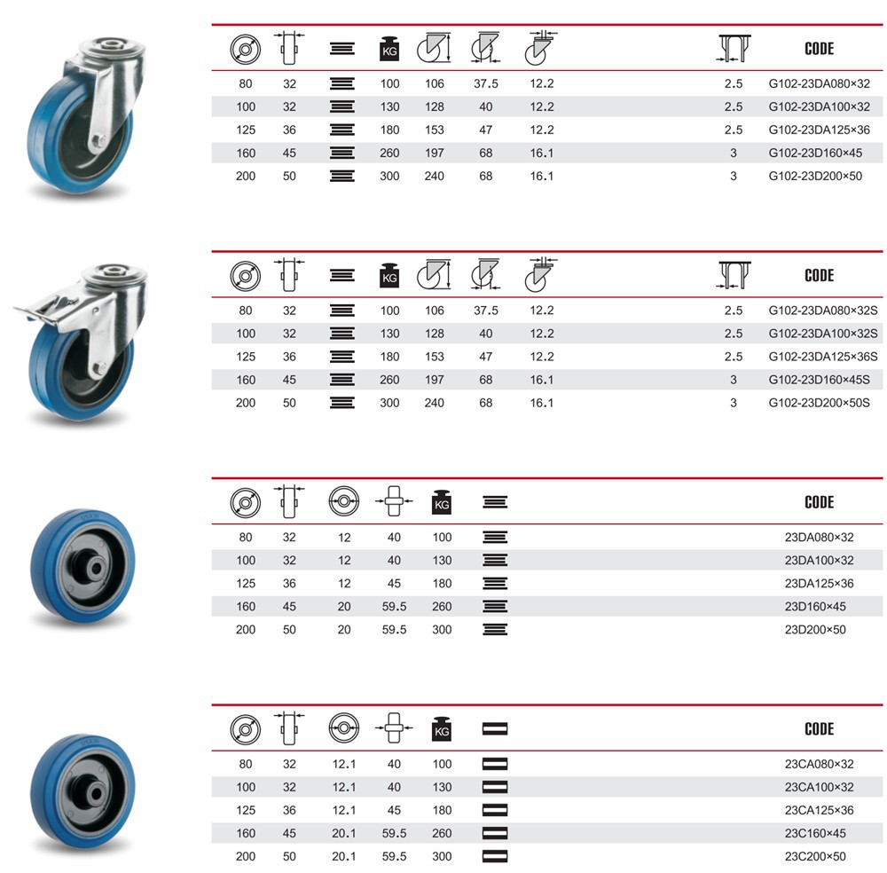 80-200 mm weiches blaues elastisches Gummirad, langlebig und stabil, geräuschlos bewegend, flexibel drehbar, kann Boden und Teppich verhindern, wir haben auch Gleitlager und Kugellager.